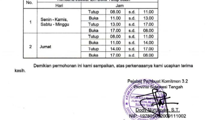 Permohonan izin buka tutup ruas jalan Bunta – Balingara tertuang dalam surat Kementrian Pekerjaan Umum Direktorat Bina Marga melalui (BPN) Sulteng tertanggal 17 Oktober 2025 di tanda tangani Pejabat Pembuat Komitmen (PPK) Dody Nurusyab,ST.